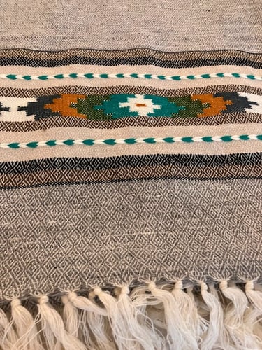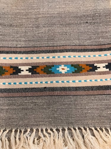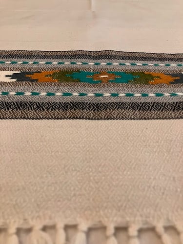 דוגמת האריג אלגנטית ומורכבת, משלבת בין אריגת יהלומים, דוגמאת CHOTTI CHSHAM שהיא עיטור אריגה גיאומטרי מסורתי הימאלאי ואריגת הצמה DORU.
