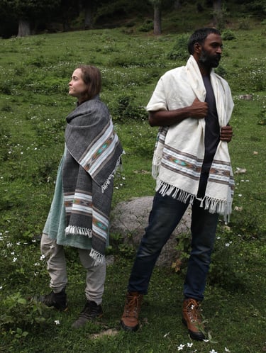 עשוי 98% צמר פשמינה בטוויה ידנית ללא צביעה, 2% צמר כבשים צבעוני