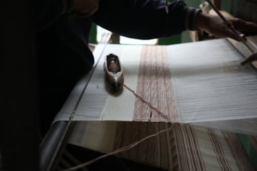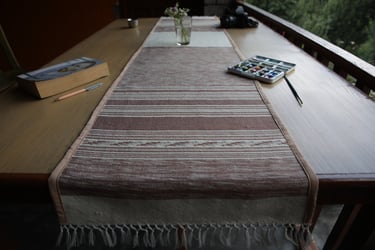 האריג בצבעי האדמה, שילוב בין אריגת יהלומים' אריגה פשוטה ודוגמת KATU שהיא עיטור אריגה גיאומטרי מסורתי הימאלאי.